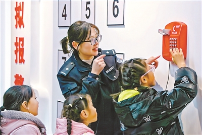 近日,民警在指導(dǎo)孩子體驗?zāi)M報警。寒假期間,江蘇省海安市公安局城西派出所聯(lián)合高新區(qū)孫莊街道海南村,組織轄區(qū)留守兒童來到市應(yīng)急安全教育體驗館,學(xué)習(xí)應(yīng)急安全知識,增強安全防范意識。周強 攝