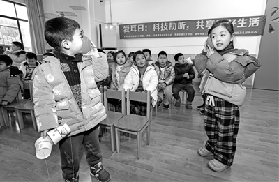 2月28日,湖州市第三幼兒園的小朋友用自制的傳聲筒感受音量對聽力產生的影響。