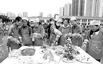 近日,重慶市永川區興龍湖小學的學生們欣賞自己烹飪的美食。該校舉行第二屆勞動技能大賽,六年級學生在教師和家長的配合下,準備食材、烹飪炒制、調味裝盤……現場菜香四溢,一派忙碌景象。陳仕川 攝