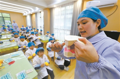為迎接世界口腔健康日,3月18日,井岡山大學(xué)附屬醫(yī)院開展“小小牙醫(yī)體驗(yàn)營”進(jìn)校園活動(dòng),組織醫(yī)生為小朋友們檢查牙齒、普及日常口腔保健常識。圖為該院口腔科醫(yī)生指導(dǎo)江西吉安吉州區(qū)保育院的孩子們正確刷牙。李軍 攝