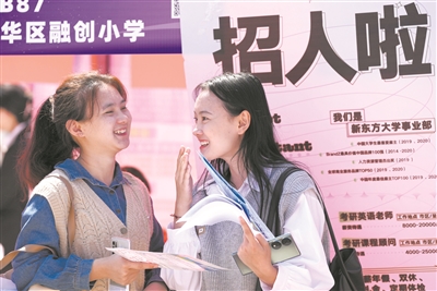 3月23日,求職學(xué)生在招聘會上交流。當(dāng)日,云南省2024年公費師范生招聘會暨云南省2024屆師范類高校畢業(yè)生雙向選擇洽談會在位于昆明市的云南師范大學(xué)呈貢主校區(qū)舉行,吸引省內(nèi)外393家用人單位、近2萬名畢業(yè)生參加。新華社記者 王靜頤 攝