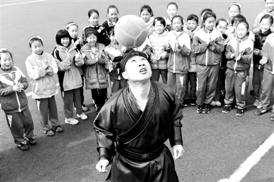 臨淄區(qū)蹴鞠非遺傳承人李偉鵬給學(xué)生展示蹴鞠動(dòng)作。崔德廣 攝