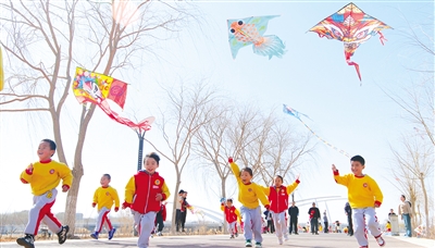 近日,甘肅省張掖市高臺縣第四幼兒園風箏節開幕,教師和孩子們通過奇思妙想繪風箏、天高云淡放風箏、喜笑顏開展風箏等系列活動,提高動手能力,樂享春日。本報記者 鄭芃生 通訊員 趙會玲 攝