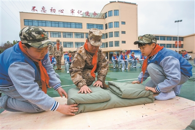 3月28日,安徽省蕪湖市繁昌區繁陽鎮實驗小學組織少先隊員走進該區人武部,開展“國防教育”主題活動。少先隊員們走進軍營,通過實踐等多種形式,普及國防知識,激發少先隊員愛軍、擁軍之情。圖為該校少先隊員在軍訓教官的指導下體驗疊軍被。 肖本祥 攝