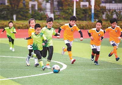 日前,江蘇省南通市紫瑯第一小學的學生在操場上進行班級足球比賽。該校將足球作為學生人人必學的運動技能,同時利用延時服務時間開展足球班級聯賽,在校園內形成“班班有球隊,人人愛足球”的良好氛圍,推動校園足球健康發展。翟慧勇 攝