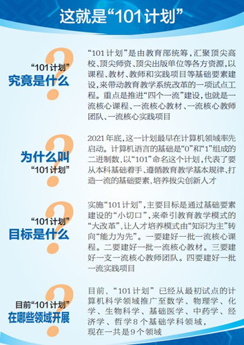建設教育強國,龍頭是高等教育,拔尖創新人才培養又是其中關鍵所在。2021年12月,“101計劃”率先在計算機領域啟動。“0”和“1”組成的二進制數是計算機語言的基礎,以“101”命名指向明晰——該計劃從基礎著手,著眼教育教學基本規律,聚焦基礎要素,著力培養拔尖創新人才。從試點的計算機領域,向基礎學科和新工科、新農科、新醫科、新文科等關鍵領域鋪開,“101計劃”志在“畫龍點睛”。