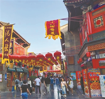 記者行走在天津古文化街,兩旁古香古色的店鋪鱗次櫛比,五顏六色的彩旗迎風(fēng)搖曳,一串串大紅燈籠橫跨街道,各種吆喝聲此起彼伏,店家們走上街頭招攬著川流不息的游人,這座環(huán)渤海而建、因漕運而興的城市散發(fā)出獨特的“煙火氣”和濃厚的文化氣息。