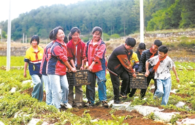 近日,貴州省黔西市文峰街道黎明小學學生在水西街道石園社區的土豆基地搬運土豆。該校組織教師,把學生帶進土豆基地,挖土豆、撿土豆、搬運土豆等,培養他們珍惜勞動果實的美德,讓學生親身感受勞動的辛勞和收獲果實的愉悅。周訓超 攝