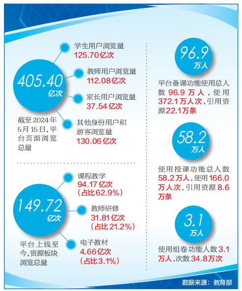 本報訊(記者 林煥新)今年是國家教育數字化戰略行動實施第三年,也是數字教育“擴優提質年”。教育部以國家中小學智慧教育平臺(簡稱平臺)全域應用試點工作為新舉措,以“集成化、智能化、國際化”為新要求,縱深推進平臺全域深化應用,以數字化助力基礎教育擴優提質。平臺上線以來,服務領域和應用規模不斷擴大,特別是試點工作啟動以來,平臺瀏覽量持續走高,截至2024年5月15日,平臺頁面瀏覽總量已達405.40億次。