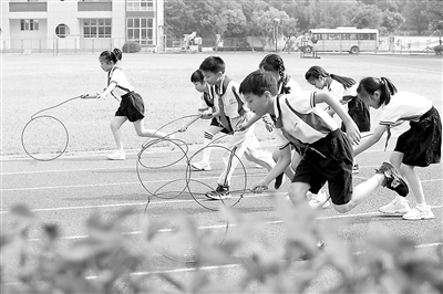 5月23日,在浙江省湖州市德清縣乾元鎮中心小學,學生們在滾鐵環,享受課間運動的快樂。倪立芳 徐越 攝