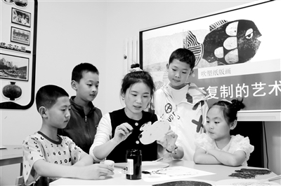 5月26日,20余名小學生在志愿者帶領下走進甘肅省平涼市靜寧縣博物館,參加主題為“復制古老文明 保護文化遺產”的吹塑紙版畫制作活動。圖為志愿者帶領學生制作版畫。