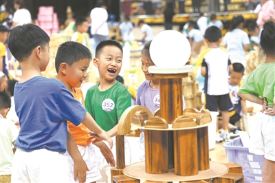 近日,浙江省諸暨市幼兒創意建構展示活動在浙江農林大學暨陽學院體育館舉行。建構活動以“兒童友好型城市”為主題,在一小時內,孩子們借助積木、紙牌、積塑等材料,用靈巧的雙手搭建出一個個富有創意的作品。本次活動是諸暨市學前教育宣傳月系列活動之一。圖為孩子們愉快地欣賞自己搭建的作品。陳霞芳 攝