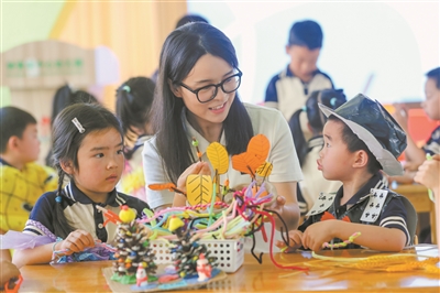 6月3日,在浙江省湖州市德清縣鐘管鎮中心幼兒園,小朋友利用廢舊物品制作手工藝品。當日,鐘管鎮垃圾分類辦聯合鎮中心幼兒園開展“低碳環保 從小做起”主題活動,通過廢舊物品手工制作等,引導孩子們養成保護環境、垃圾分類的好習慣。王樹成 攝
