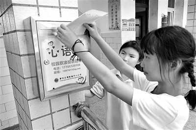 6月12日,湖北省十堰市鄖陽區柳陂鎮中心小學雙胞胎留守兒童周芷莀和周苡莀把“心事”寫成書信投進“心語箱”。針對目前留守兒童多、溝通難的實際,鄖陽區為238所學校設置“心語箱”700多個,鼓勵孩子們把平時不敢說、無處說的話“悄悄”寫出來,通過“心語箱”告訴學校,從而幫助學生解開“心里的疙瘩”,快樂地成長。