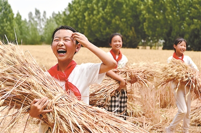 6月12日,山東濰坊高密市大牟家鎮(zhèn)官廳小學(xué)學(xué)生在校園麥田里搬運收獲的小麥。學(xué)生在勞動教師指導(dǎo)下,收割、捆扎、運輸小麥,撿拾麥穗,在忙碌中感受勞動的艱辛和豐收的快樂。李海濤 攝