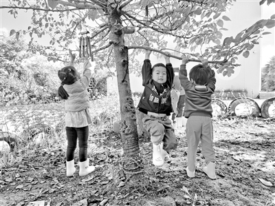 從“我”到“我們”。當(dāng)孩子們的游戲越來越豐富,相互之間也有了更多合作與謙讓:有了小紛爭,有“小裁判”評理;為摘到最高處的桃子,齊心協(xié)力搬來桌子、凳子、梯子,架著扶著還不忘叮嚀“小心點兒”……孩子們心中越來越有愛,并漸漸化為行動。小班的鑫鑫身體較弱,上臺階對他是個挑戰(zhàn)。當(dāng)他在臺階前徘徊時,大班一個哥哥伸出的手給了他勇氣。慢慢地,伸出的手越來越多,所有孩子不管年齡大小,只要看到他,都會特意等他,并一路護送到教室。在接納、包容與互助中,孩子們從“我”慢慢變成了“我們”。