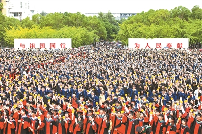 近日,華中農業大學畢業典禮現場,寫有“與祖國同行 為人民奉獻”的巨型桁架分外醒目。全體畢業生喊出“奮斗書寫華章 強國復興有我”的響亮口號,奔赴人生下一站。