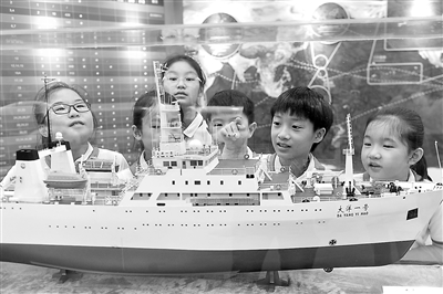 7月3日,在自然資源部第一海洋研究所中國大洋樣品館,山東省青島市市北區北山二路小學學生在參觀“大洋一號”綜合性遠洋科考船模型。暑期,該校學生走進中國大洋樣品館,在豐富的海洋礦物樣品中,探索奇妙的海底世界,感受科技的魅力。