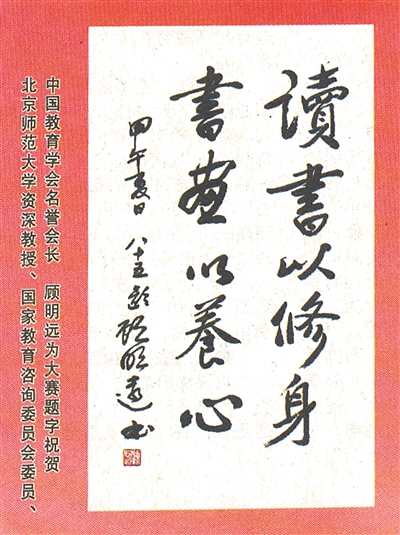 顧先生為人師表,德藝雙馨。他給學校題詞,是他對教育事業的另一種無私奉獻。他的題詞內容和書法藝術,成為學校文化一道亮麗的風景。顧先生說,寫字、書法,是中國傳統教育的入門課和必修課,不僅僅是一種技能訓練,而是有全面育人的重要作用。他希望學校重視書法教育,老師和學生都寫好中國字,傳承中華文化。
