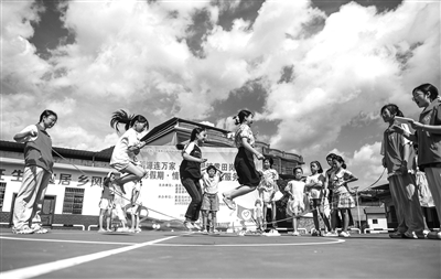 7月17日,在湖南省永州市道縣仙子腳鎮黃田崗村,孩子們和志愿者一起跳繩。