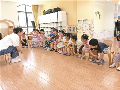 走進奉化區茗山星辰幼兒園的音樂教室,孩子們正在教師的帶領下用樂器發出不同的聲響和節奏,感受音樂的魅力。“雖然現在是暑期,但是我們依舊和往常一樣,嚴格按照既定計劃開展保教活動。”該園園長張薇介紹。