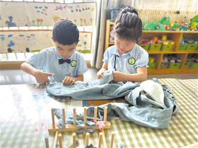 日前,江蘇省鹽城市鹽都區(qū)實驗幼兒園的大班孩子們,將從家中收集過來的廢舊牛仔褲變廢為寶,動手制作羽毛掛件、牛仔小包等手工作品,作為特別的畢業(yè)禮物,送給幼兒園里的小弟弟、小妹妹。劉玉梅 攝