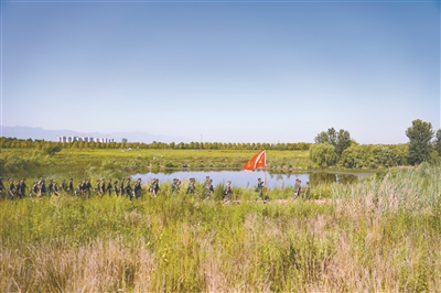 “稍息,立正,向左看齊,向前看!”教官在整頓隊伍紀律后向?qū)W生們介紹,“今天的徒步行軍要從梁家橋至詩經(jīng)里,共計15公里,大家能不能堅持到最后?”“能!”鏗鏘有力的聲音瞬間響徹河畔。