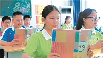 “泰山古稱岱山,有‘天下第一山’的美稱,泰的意思是安定、美好、極、通暢。在中國人心中,泰山就是一座大美之山。”在泰山學院附屬中學初二(10)班教室里,語文教師時曉筠正帶領學生學習統編語文教材七年級下冊里的《望岳》。窗外,抬頭便可見泰山的輪廓。