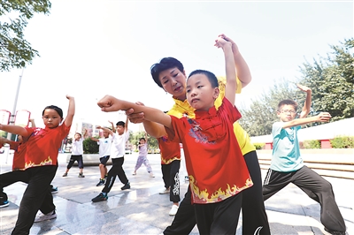 近日,在河北省唐山市豐潤區時代廣場,專業教師在指導學生學習武術。暑假期間,河北唐山中小學生通過學習武術來強身健體,磨煉意志,豐富假期生活。