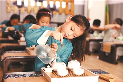 8月13日,浙江省湖州市德清縣乾元鎮東郊社區圓圓幼兒園的孩子們在練習茶藝。暑假期間,該鎮東郊社區婦聯攜手圓圓幼兒園開展托管班,孩子們參與練茶藝、玩手球等,度過快樂而有意義的假期。倪立芳 陸建如 攝