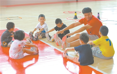 為培養(yǎng)幼兒對(duì)運(yùn)動(dòng)的興趣,河北省滄州市第一幼兒園東園區(qū)小班幼兒日前走進(jìn)籃球俱樂(lè)部,開展“籃球悅童心 運(yùn)動(dòng)強(qiáng)體魄”暑期體驗(yàn)活動(dòng),讓幼兒在歡樂(lè)、自由的氛圍中享受運(yùn)動(dòng)的樂(lè)趣。圖為教練在帶幼兒進(jìn)行熱身活動(dòng)。