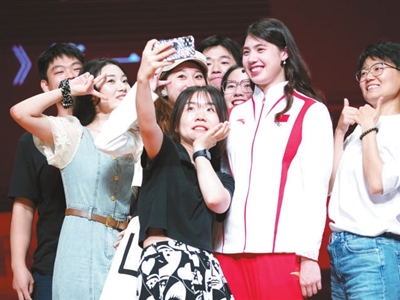 9月19日,張雨霏(右二)在活動現場與學生自拍合影。當日,新學期北京大學“冠軍講堂”暨《體育文化與創新精神》公選課開課,世界冠軍、巴黎奧運會獎牌獲得者張雨霏、曹緣、李雯雯和鄒敬園走上講臺,與北大學子互動交流。 新華社記者 雒圓 攝