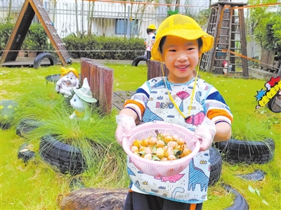 秋天到了,福建省福州市馬尾第三實驗幼兒園的幼兒走進自然,用小小的手掌觸摸一草一木,在采摘中打開心扉,禮贊自然饋贈,發(fā)現(xiàn)生活之美。圖為幼兒展示收集到的果實。 陳景琳 攝