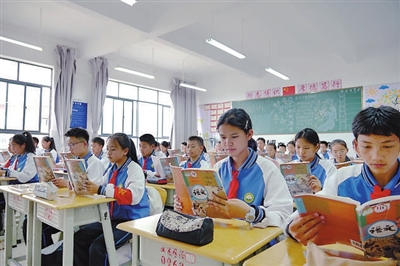 云南省麗江市玉龍納西族自治縣文筆學校學生在學習《一滴水經過麗江》。本報記者 陳經宇 攝