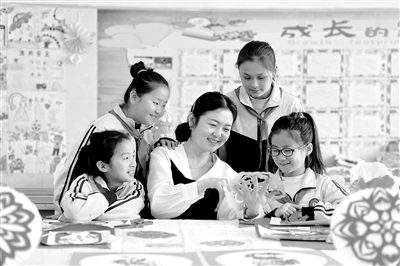 滕州市書院小學(xué)美術(shù)教師陳楠楠指導(dǎo)學(xué)生做剪紙。滕州市教體局供圖