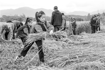 近日,浙江省湖州市長(zhǎng)興縣煤山鎮(zhèn)中心小學(xué)開(kāi)展“金秋稻香”手工割稻比賽,學(xué)生們和村民在金色的田野里割稻子、打谷子,在緊張激烈的角逐中體驗(yàn)豐收的樂(lè)趣,感受傳統(tǒng)農(nóng)耕文化。