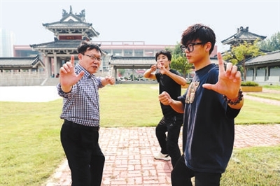 齊魯師范學院黨委書記林松柏(左一)十分關注學生的訓練情況,經常親自指導他們練習武術動作。