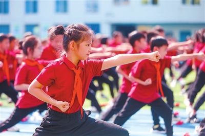 “少年強則國強……”在山東省實驗小學,伴隨著《少年中國說》的音樂,全校學生做起了課間武術操。一招一式,虎虎生威。從2018年起,齊魯師范學院武術教育中心幫助該校開設了武術課程,實施“教—練一體、升—賽激勵”體系,安排專職教練在校授課,學校武術隊在多個省級、國家級武術賽事中獲獎。