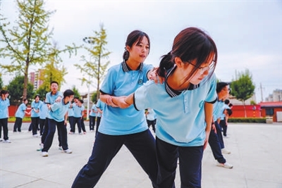 在齊魯師范學院附屬中學——長清中學校園里,學生們正在學習反擒拿術。