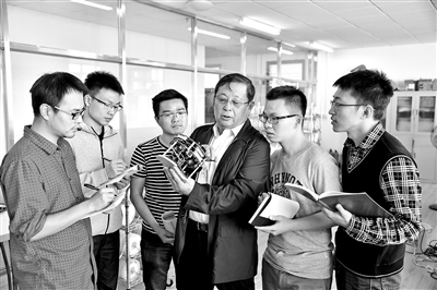 中國(guó)工程院院士、哈爾濱工程大學(xué)教授楊德森(右三)在指導(dǎo)學(xué)生做科研。 哈爾濱工程大學(xué)供圖
