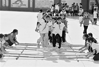 10月25日,廣西梧州市平浪希望小學學生在體育大課間跳竹竿舞。近年來,梧州市積極推進民族傳統體育進校園,將拋繡球、打陀螺、斗駒、板鞋競速等數十種項目引入學校,在提升學生身體素質的同時,促進各民族青少年之間的交流。新華社記者 黃孝邦 攝