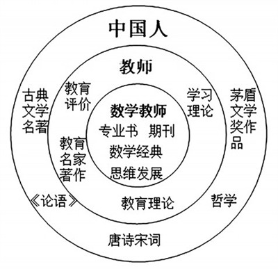 今年,我有幸到許多省份給數學教師作講座和交流,交談中,他們讓我推薦幾本“最管用的書”。平時教師們工作很忙,抽不出太多時間看書,現在書又太多,經常不知道讀哪一本管用。那么,數學教師該讀哪些書?結合讀過的書,我做了一個自己的“讀書身份擴展圖”(見下圖)。