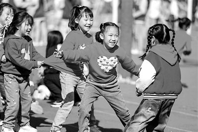 10月29日,在青島市李滄區(qū)虎山路小學,學生在課間進行“老鷹捉小雞”游戲。今年以來,李滄區(qū)在全區(qū)小學實行課間10分鐘延長至15分鐘。各學校根據實際情況開展豐富的課間活動,促進學生健康成長。 張鷹 攝