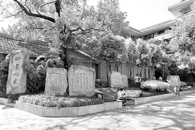 石室中學校園內,學生在鐫刻有歷代文人追思文翁和石室的詩文碑林旁讀書。學校供圖