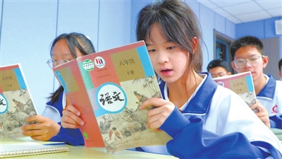 格爾木市第五中學(xué)學(xué)生在課堂上誦讀《在長(zhǎng)江源頭各拉丹冬》。 本報(bào)記者 梁瑞哲 攝