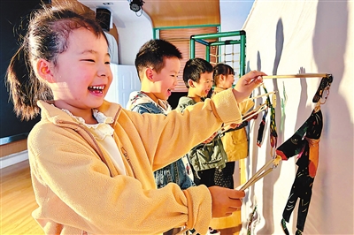 11月14日,在浙江省湖州市長興縣水木花都幼兒園,孩子們體驗非遺皮影戲。長興縣教育部門挖掘利用本地鄉(xiāng)土文化資源,組織百葉龍、下箬馬燈、木偶戲等民俗文化和民間技藝進校園活動近百場。