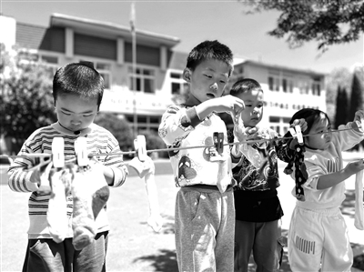 孩子們在晾曬自己剛洗完的小襪子。王悅 攝