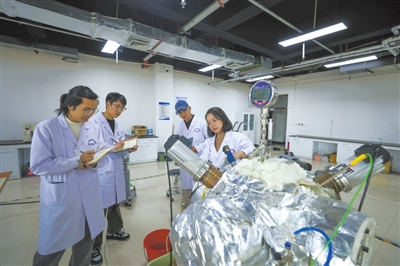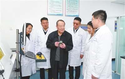 在河南理工大學國家重點實驗室,該校1962級校友、中國工程院院士張鐵崗(左三)指導團隊青年教師及博士生開展受載低滲煤樣裂隙分布及發育規律的CT掃描實驗。