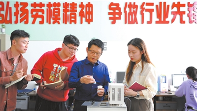 在“河南省總工會魏建平勞模創新工作室”里,“全國高校黃大年式教師團隊”帶頭人、河南理工大學教授魏建平(右二)為學生們講解煤層注水添加劑的選配以及潤濕效果。