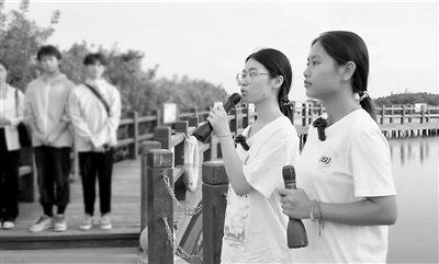廣東海洋大學學生在紅樹林畔開展思政實踐。 資料圖片
